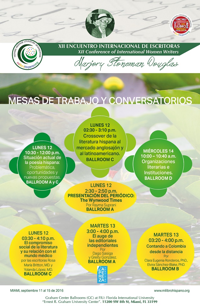 La Hispanic Heritage Literature Organization / Milibrohispano.org, organización sin ánimo de lucro 501(c)3, fundada por la escritora Pilar Vélez en la ciudad de Miami, la comunidad literaria representada por escritoras y escritores de 22 nacionalidades, Florida International University y las organizaciones que apoyan el XII Encuentro Internacional de Escritoras dedicado a Marjory Stoneman Douglas, invitan a la comunidad del sur de la Florida a que asista al ciclo de conferencias, paneles, presentaciones de libros, talleres y mesas de trabajo que tendrán lugar en FIU, entre el 12 y el 14 de septiembre de 2016.